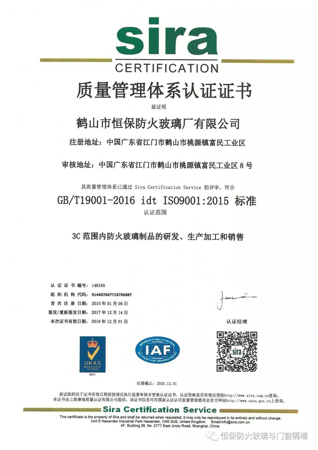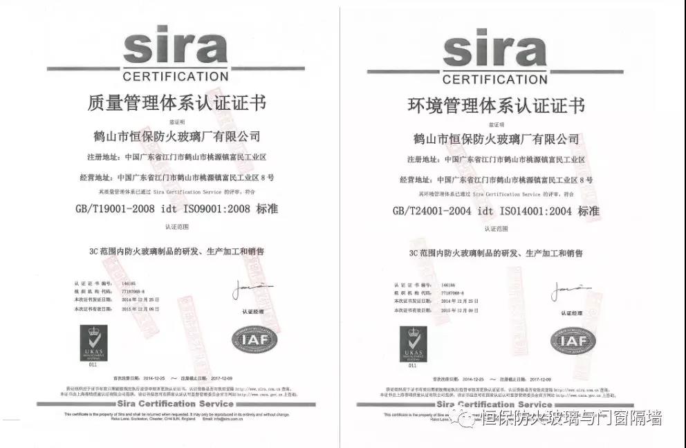 鶴山市恒保防火玻璃廠有限公司,自2014年第一次獲得ISO9001-2008質(zhì)量管理體系、ISO14001-2008環(huán)境管理體系認(rèn)證。并與原企業(yè)管理體系相結(jié)合,與CCC強(qiáng)制性認(rèn)證產(chǎn)品企業(yè)管理體系相融合,建立了更完善的科研、開(kāi)發(fā)、生產(chǎn)、銷(xiāo)售和售后服務(wù)體系,使恒保公司穩(wěn)健快速增長(zhǎng)。