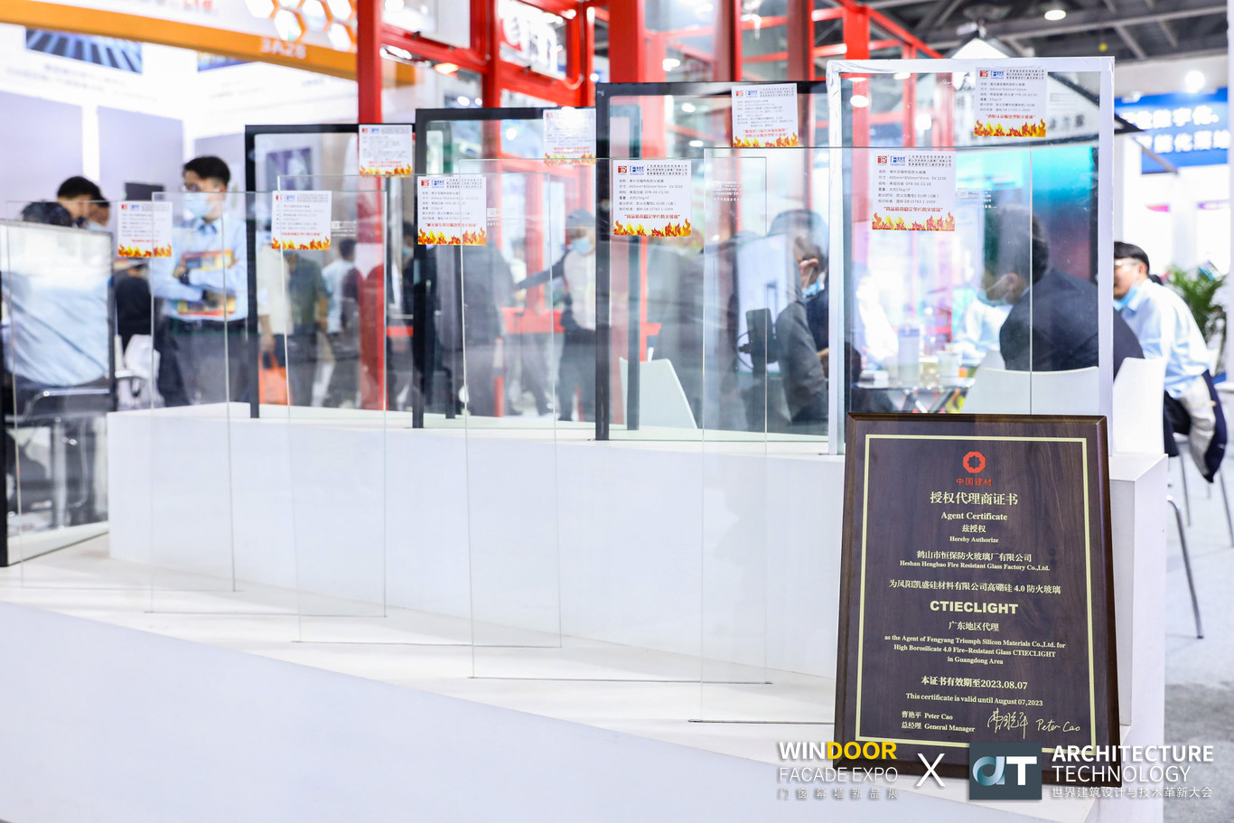 恒保還成為鳳陽凱盛高硼硅防火玻璃的廣東代理,在展會上也有相關產品的展示,此外還有高應力防火玻璃、非隔熱夾層的B類防火玻璃,以及隔熱型的防火玻璃等,隔熱型主要有三款,水晶硅防火玻璃、納米硅防火玻璃,以及復合灌漿防火玻璃。